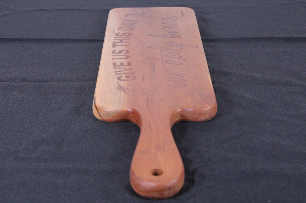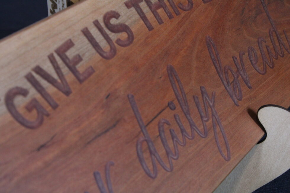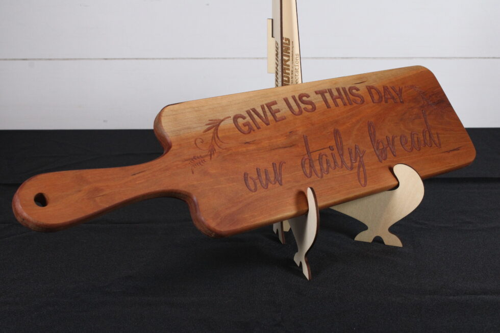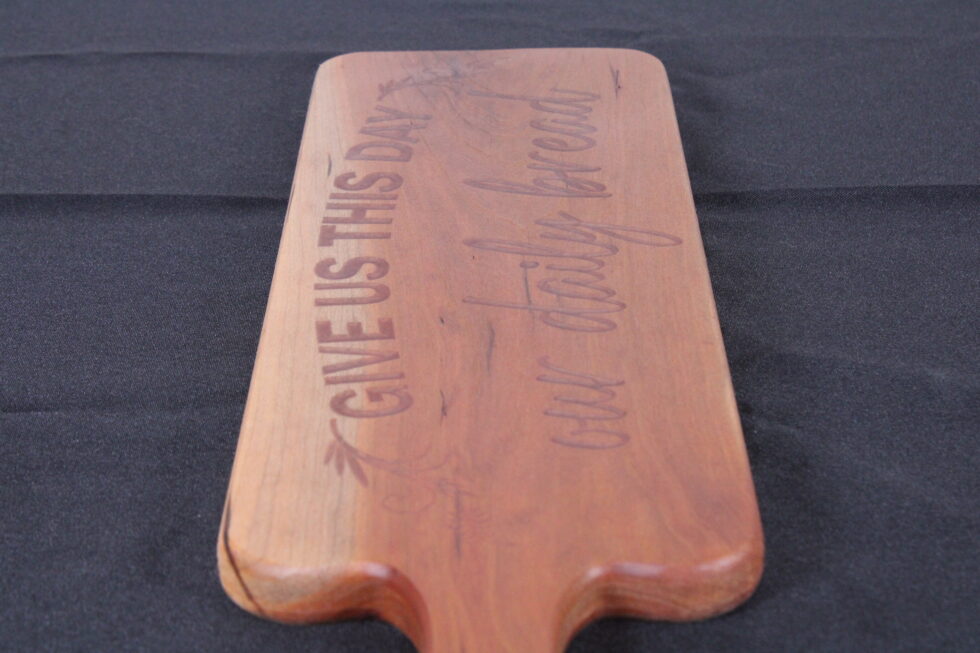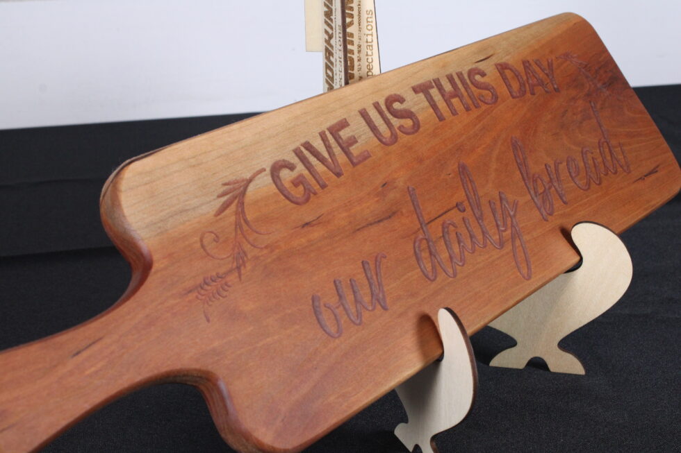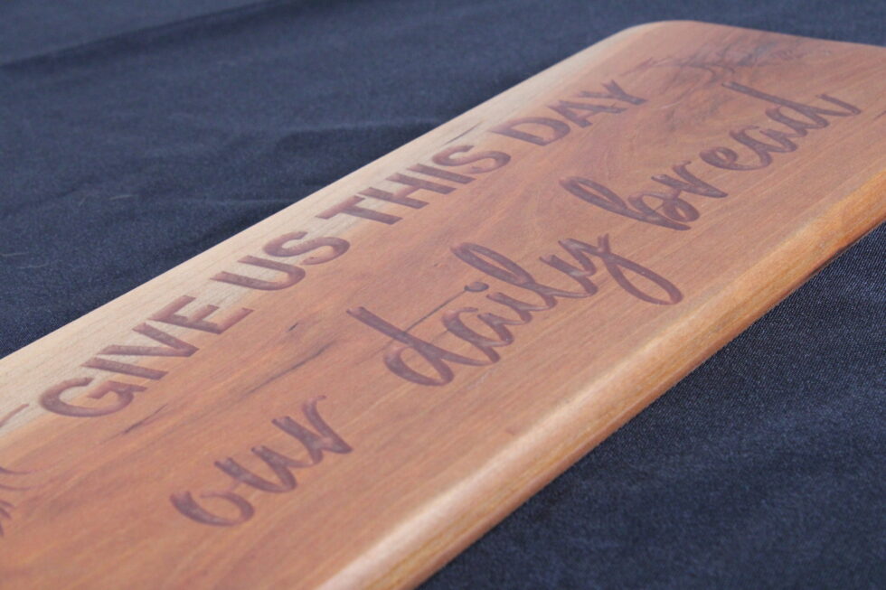 Crafted from warm, rich cherry wood, this breadboard features the timeless phrase “Give us this day our daily bread” set in clear epoxy, creating a smooth, durable, and visually striking centerpiece for your kitchen. The combination of natural cherry and epoxy gives the board a modern, elegant touch while keeping it fully functional for daily use.