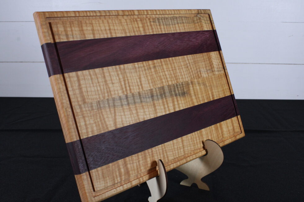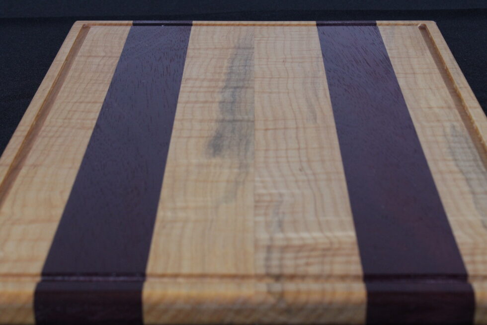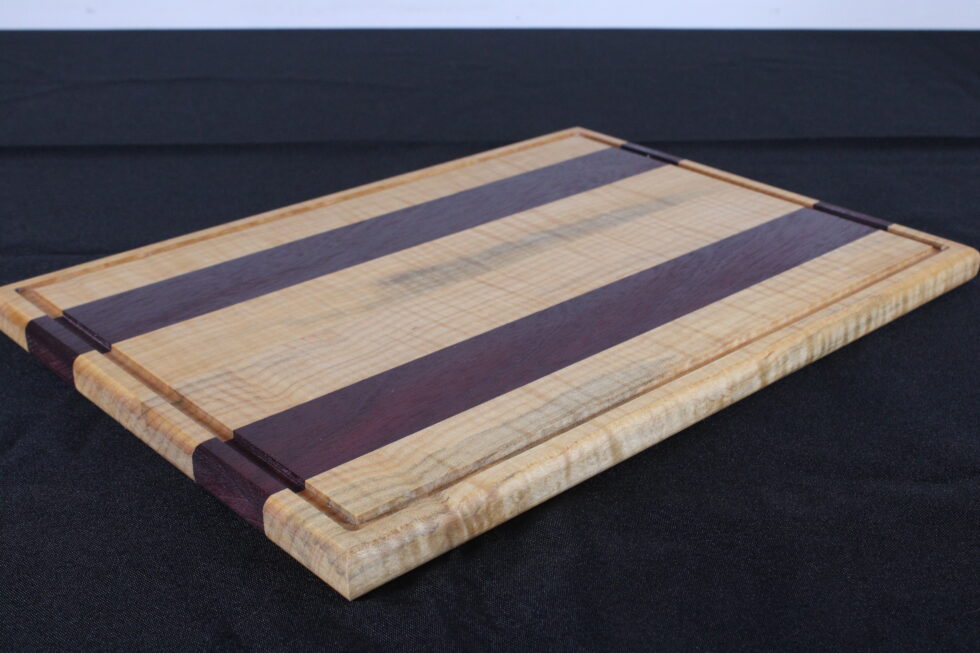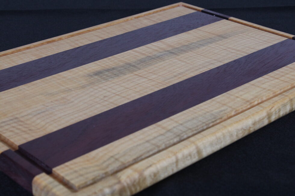Crafted from quilted maple and purpleheart, this edge-grain cutting board combines durability with striking visual appeal. The rich contrast between the woods highlights their natural beauty, making it a standout addition to any kitchen.
