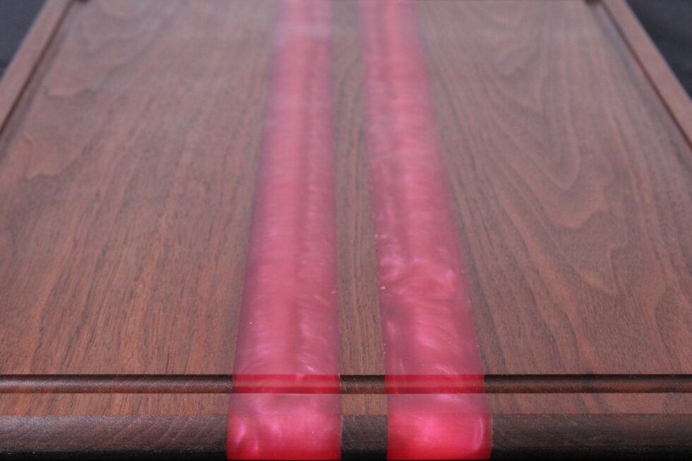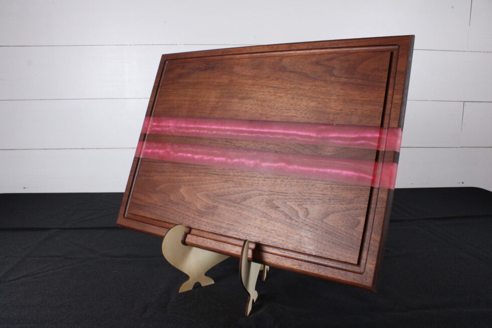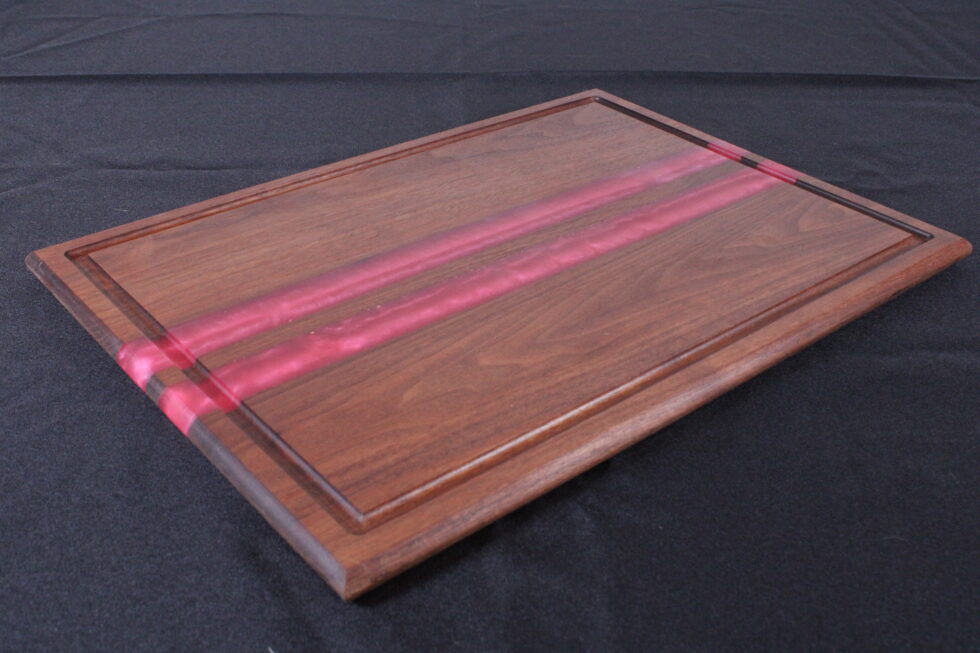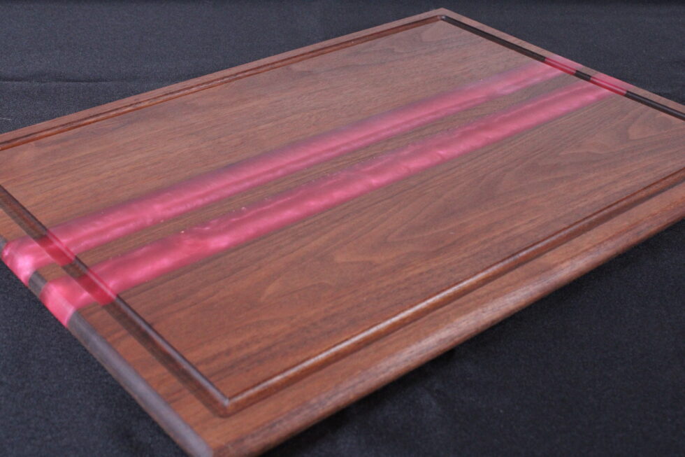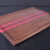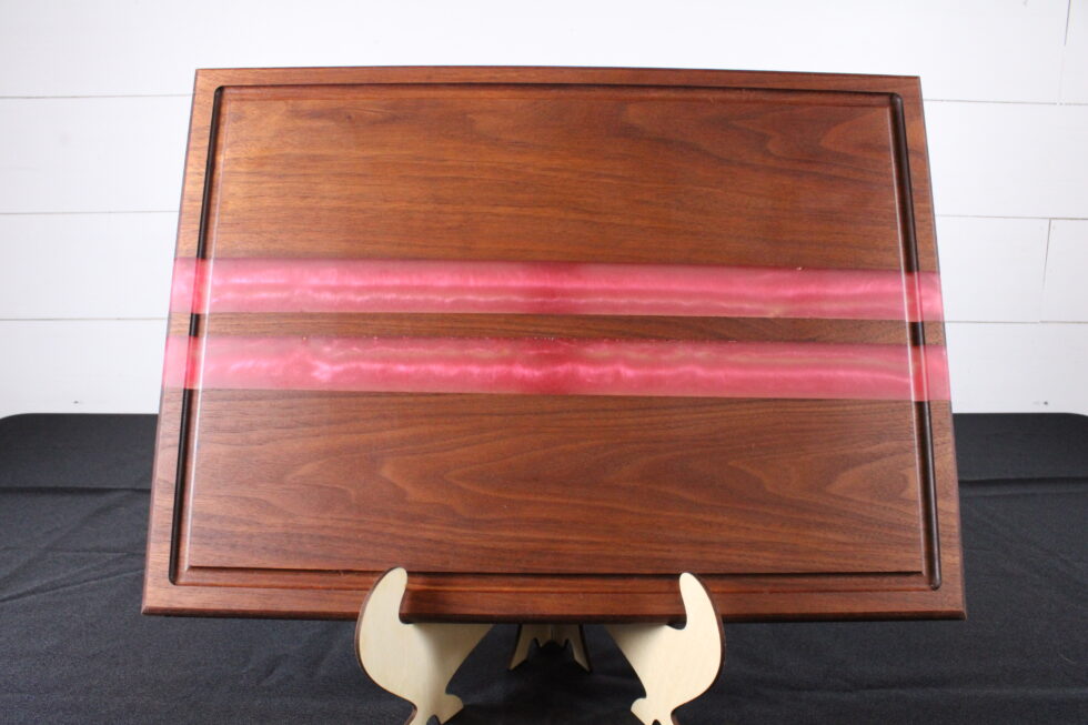 Rich walnut meets bold design in this handcrafted cutting board featuring hand-poured pink epoxy stripes that cut cleanly through deep, natural grain. The contrast is striking — warm, dark hardwood paired with vibrant color for a look that feels both modern and timeless.